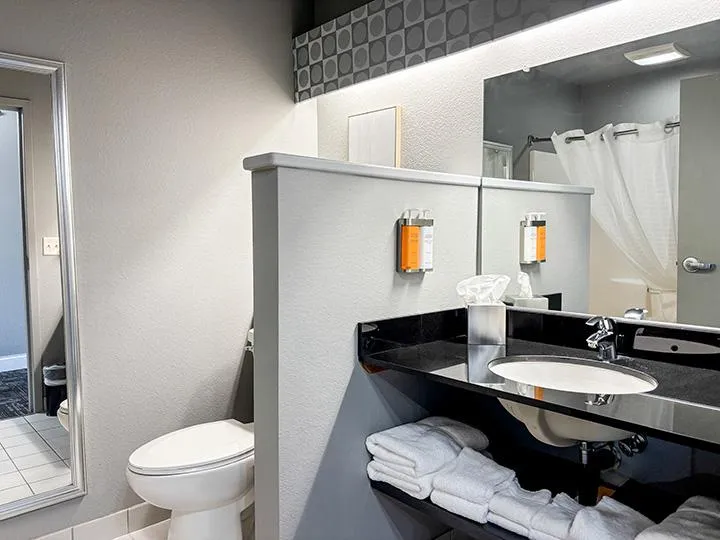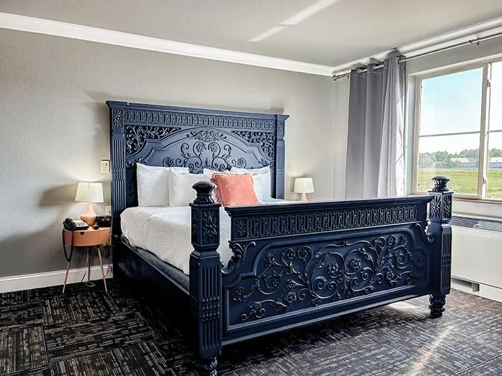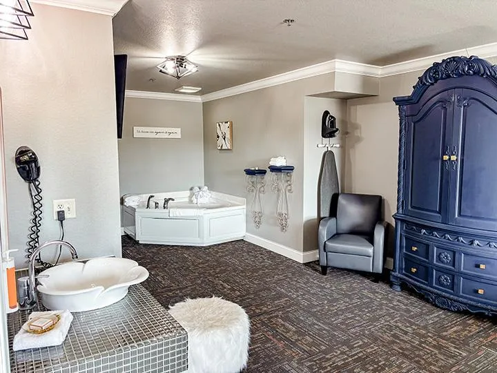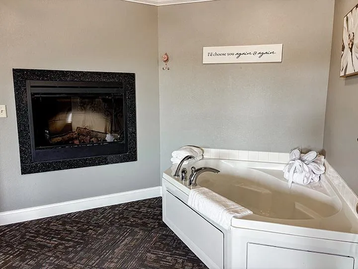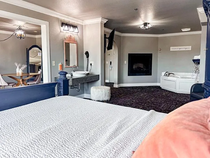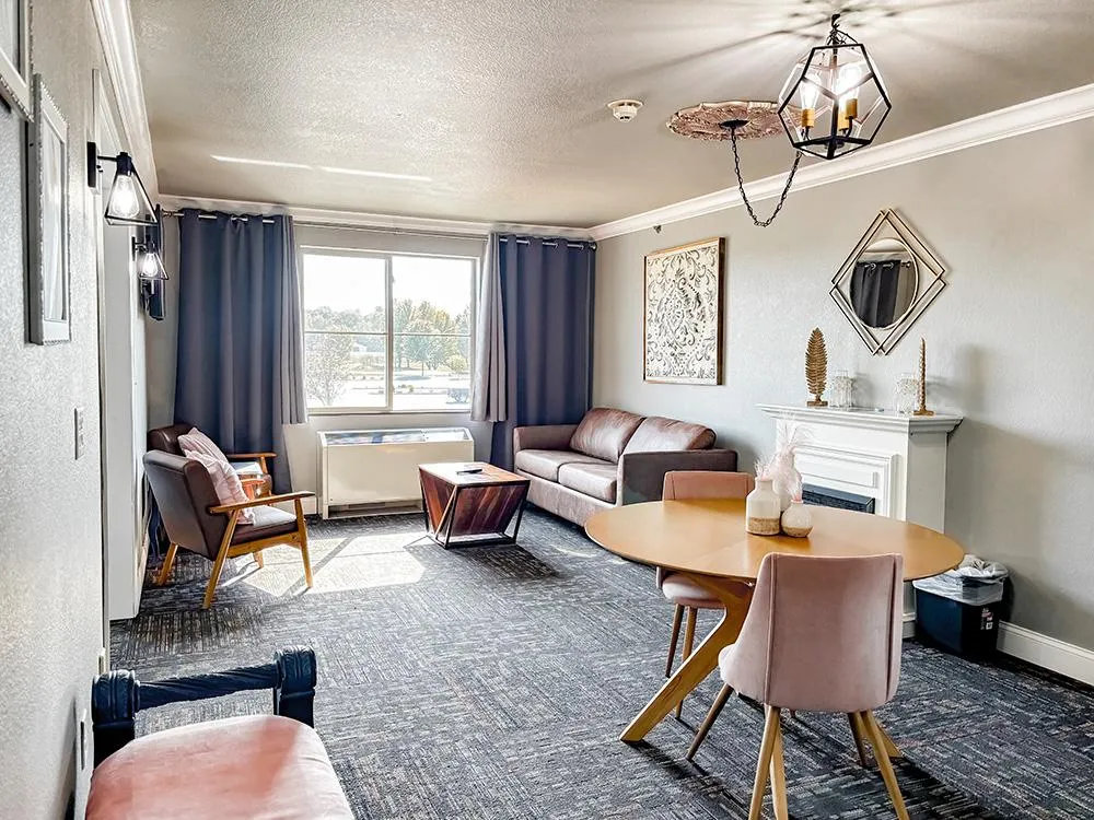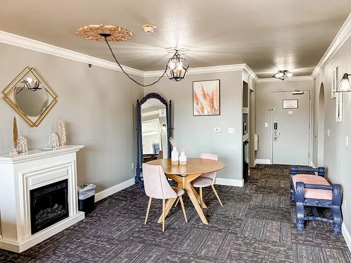 The Blush Honeymoon Suite offers an elevated stay with thoughtful features designed for comfort and relaxation. This spacious suite includes a king bed and a queen sofa sleeper in the living area, along with a full bathroom. Guests can unwind in the Jacuzzi whirlpool, cozy up by one of the two fireplaces, or enjoy meals at the dining table. Stylish and versatile, the Blush Honeymoon Suite is ideal for couples, families, or anyone looking for a memorable stay at Metropolis Resort.