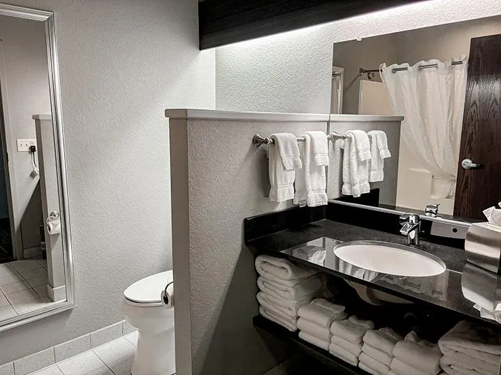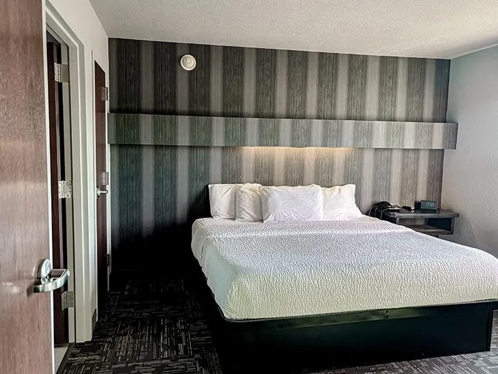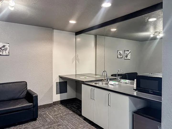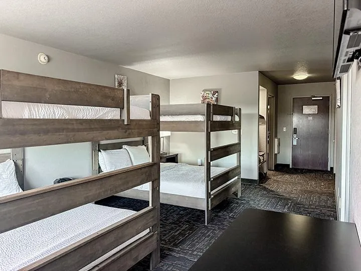 Our One Bedroom Suites are perfect for families or groups who want a little more space and privacy during their stay. Each suite includes a separate bedroom with a king bed, plus two queen-sized bunk beds and a queen sofa sleeper to comfortably accommodate larger groups. A bar counter with a sink and a large mirror make sharing the space easier, while two bathrooms ensure everyone has the convenience they need. With its spacious layout and flexible sleeping options, the One Bedroom Suite is a comfortable home base for fun-filled days at Metropolis Resort.