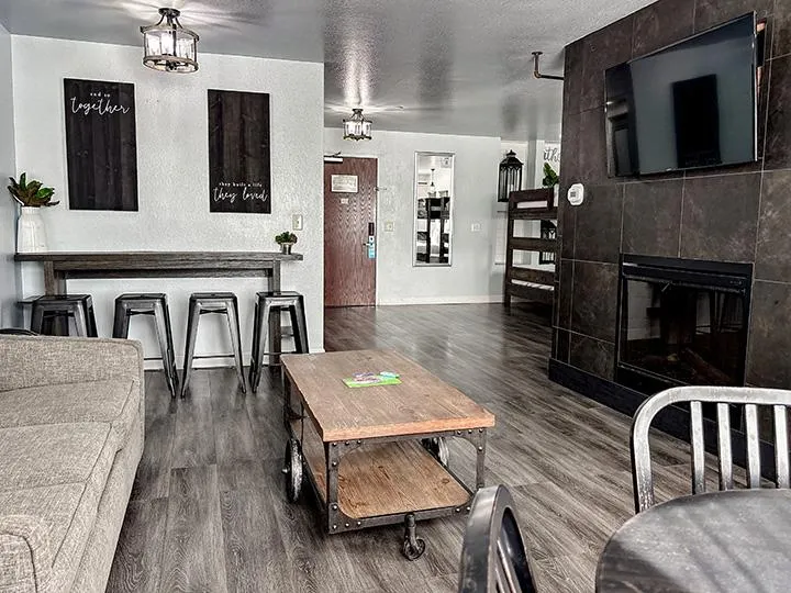 Enjoy a roomy living area with two fireplaces, a bar with stools, a dining table with chairs, and a full bathroom. The Magnolia Bunk is the perfect blend of comfort and style after a day of excitement at Metropolis Resort and Chaos Water Park.