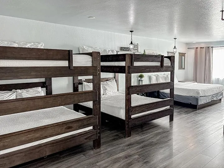 Our Family Bunk Room is perfect for large families, sports teams, or group getaways. With five queen beds, a bathroom, extra vanity, and breakfast counter, it’s built for togetherness.
