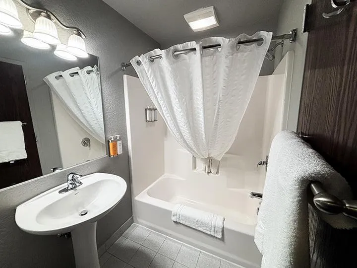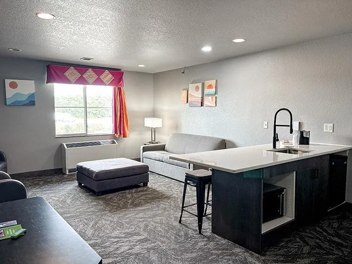 Our Two Bedroom Suites are ideal for families or groups looking for extra space and comfort. One bedroom includes a king bed, while the second features two queen beds, with a queen sofa sleeper in the living room for added flexibility. The suite also offers a spacious living area, a breakfast bar with seating for four, and two full bathrooms to make sharing the space easy. With room to spread out and relax, the Two Bedroom Suite is a great choice for longer stays or group getaways at Metropolis Resort.